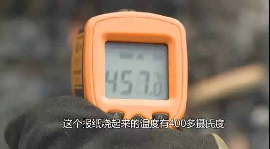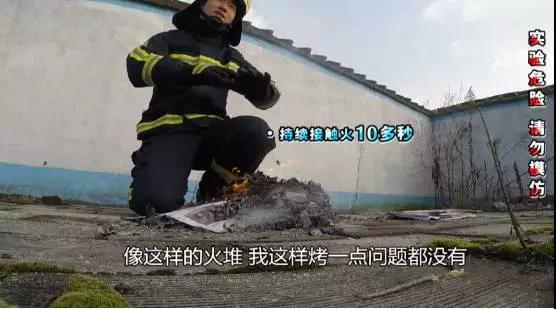 點燃報紙,燃燒的溫度是500度左右,大史穿著消防服,直接把手伸進(jìn)火里,感覺是很暖和,還挺舒服,手離開火堆馬上降溫。
