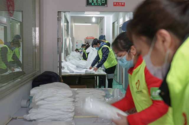 志愿者的工作為輔助性質(zhì),為配合一線技術(shù)工人的工作時長,志愿者服務(wù)時間分為白班和夜班。白班為早上8點(diǎn)至晚上9點(diǎn),夜班為晚上9點(diǎn)至凌晨5點(diǎn)。每個班次至少20人,并適時根據(jù)生產(chǎn)要求增加。長時間、高強(qiáng)度的班次安排,對專業(yè)的技術(shù)工人來說壓力都不小,對志愿者的挑戰(zhàn)就更大。志愿者嚴(yán)帥說:“我們技術(shù)工作做不了,但疊衣服和裝箱,都能干!”長時間站立、埋頭工作非常辛苦,但很多志愿者都舍不得輪換休息,從頭到尾不停地在工作。