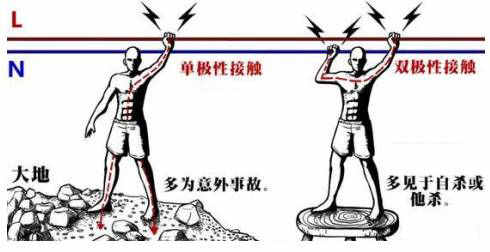 雙極性接觸觸電:即人體同時(shí)接觸火線與零線,形成回路,而無(wú)需經(jīng)過(guò)大地,所以此時(shí)絕緣鞋不起作用,這種觸電情況多為自殺或他殺,發(fā)生機(jī)率很小。